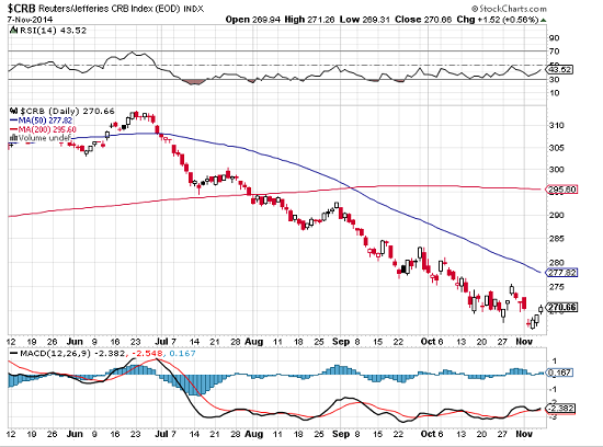 The weekly chart of the CRB, the index of commodity prices shows levels at 26 month lows ealier this month, although an improvement was seen this week;