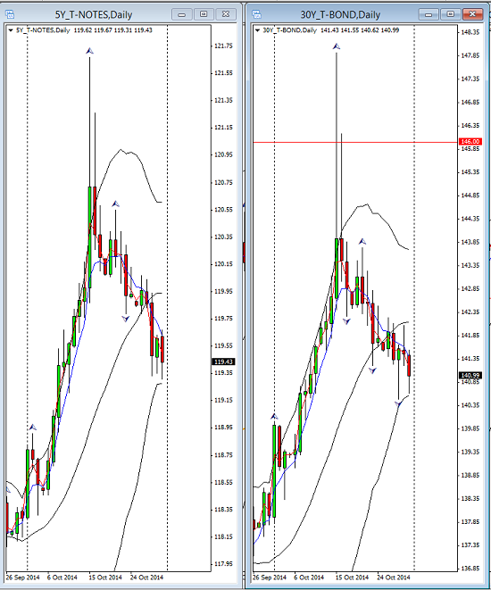 It closed at 0.84, admittedly above its low for the month but the downtrend is disturbing for those trying to be optimistic for even a weak recovery. The US up-beat week was reflected in the US bond market not just in the 10yr note but across the board. Here is the bond price inverse to the yield in the 5yr and 30yr note.