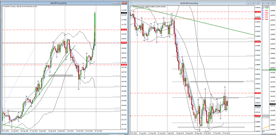 And the dollar reacted even more to Japanese news than to the FOMC earlier in the week. With deflation looming in the Eurozone and in Japan there is no way for the Dollar than to resume it’s uptrend and that is precisely what it did. Whilst wild moves were seen in the USDJPY and the EURUSD, there are pairs still in consolidation which presents dollar buying opportunities. These 2 charts show the different effect in the USDJPY and one of our commodity pairs, AUDUSD
