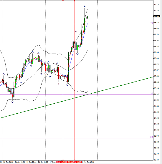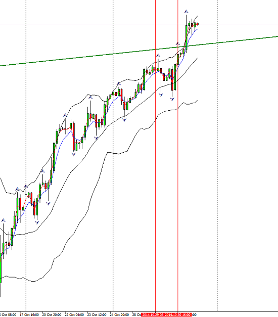 When I started to accumulate material for this week’s report on Thursday evening, it was going to be focused on the FOMC decision to end QE. This was indeed big news and had its effect felt in the market though only halted the equity uptrend to a minor degree. . Whilst interest rates stayed the same the tone of the FOMC was much more upbeat especially where employment statistics were concerned and the hawks had their way with the QE program. This after speculation only last week from a Fed member that more QE might be appropriate if the data doesn’t stand up to the growth tests. So yes it was unexpected but the market did seem to take it in its stride. Here is the S&P four hour chart for the 29th.