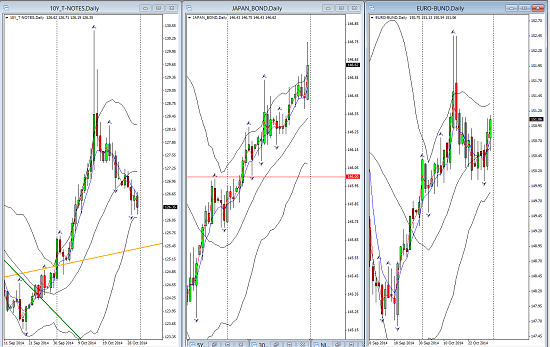 The Bond market has revealed its own wisdom this week. As the following chart displays very clearly, Japanese and European Bonds have headed up bringing yields ever lower. The US bonds declined this week as their yields rose on continuing and now affirmed expectation of economic recovery.