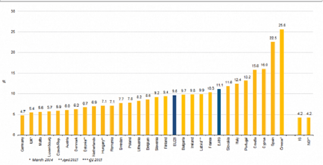 And more on the subject of why austerity cannot help as now the IMF have rather belatedly admitted; Eurozone unemployment stats as at May 2015;