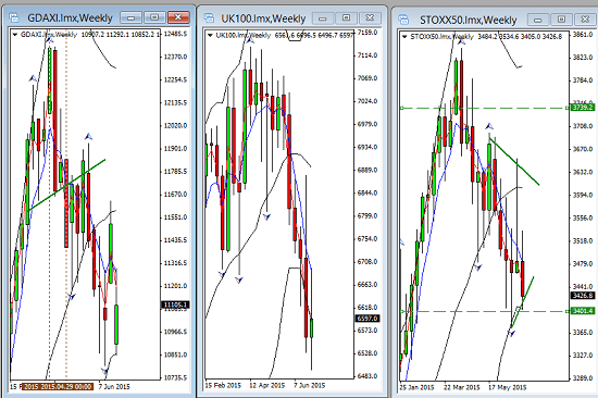 In Europe the equities showed the nerves starting as they did with the opening gaps last week following the enforced closure of the Greek Banks. These are on a weekly chart so as to remove some of the volatility noise;
