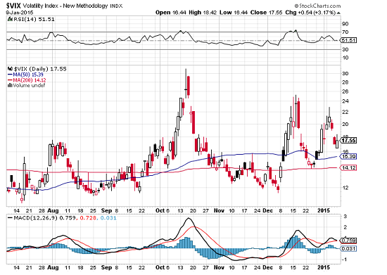 On the subject of sentiment it should be noted that the VIX spiked to 23 this week but fell back towards 16. Even 23 is still a relatively low level but the index is itself more active. Chart courtesy of stockcharts.com:
