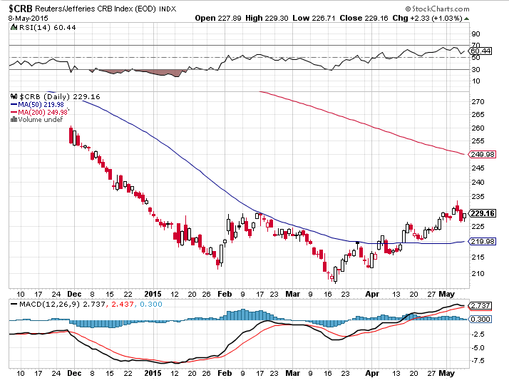With the index weighted towards oil the rally has continued since the middle of March with a small pullback this week. Iron ore and copper have rallied with the oil market. But a word of caution; as with oil there would seem to be a requirement now for solid global growth and demand to sustain this rally and there are not too many signs of that yet. We cannot yet say this is more than a correction in the drastic down-move that preceded it;