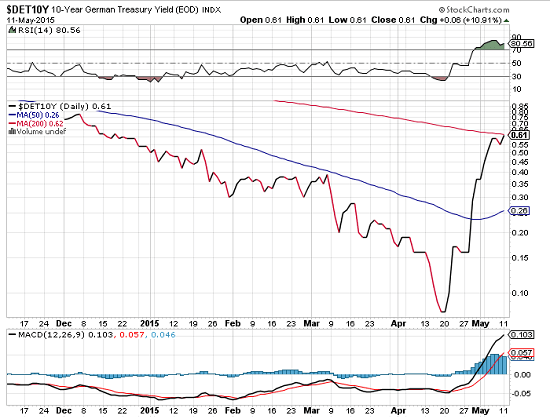 There is not much doubt that major positions have been closing out what is known as the QE trade, the bond buying spree in anticipation of monthly liquidity from the ECB. There was among the funds an anticipation of profit as the ECB’s buying targets gobble up the supply side on a monthly basis pushing up values. Their intention is for QE to continue at least 18months from its commencement. The resulting yield drops have been dramatic to say the least as we watched  the German 10 yr yield fall towards the negative side. What has happened in the last two weeks wrong footed some of the most seasoned professionals. Chart courtesy of stockcharts.com;