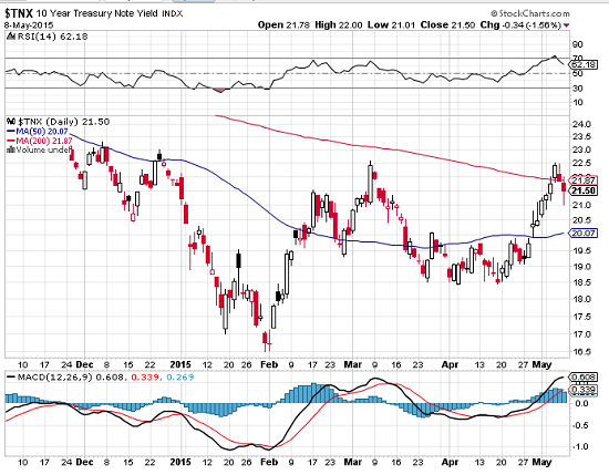 As the chart shows the yield has itself seen a significant rise advancing effortlessly through 2% to 22.5 settling back 4 basis points on Friday after NFP to 21.50