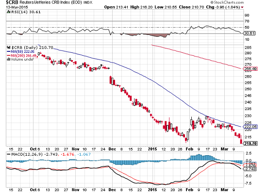 There is a further decline in commodities which will affect the commodity currencies. Here is the CRB on a daily chart;