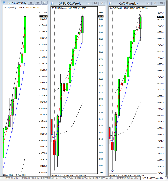 In the European bourses all systems are go as QE brings money into the economy. Here is a chart of the DAX, CAC and Euro 50 on weekly time frames.
